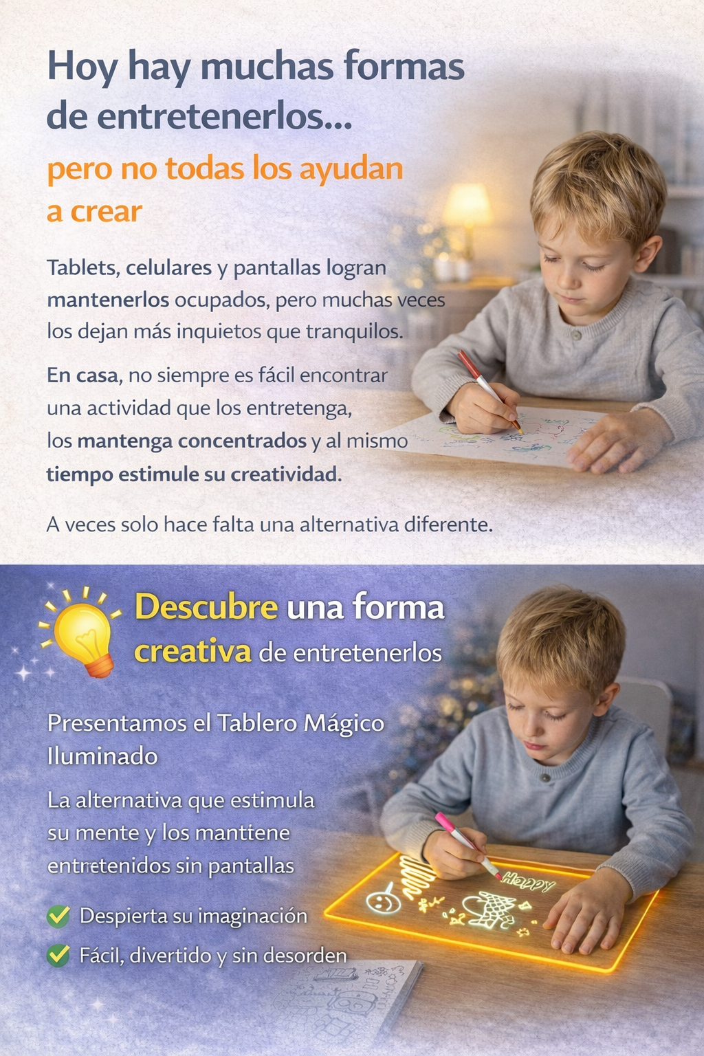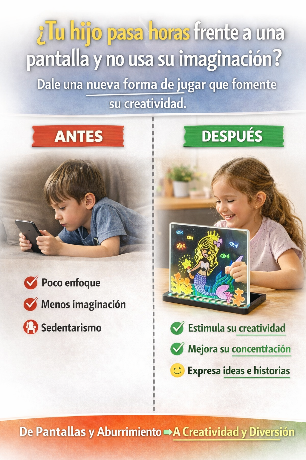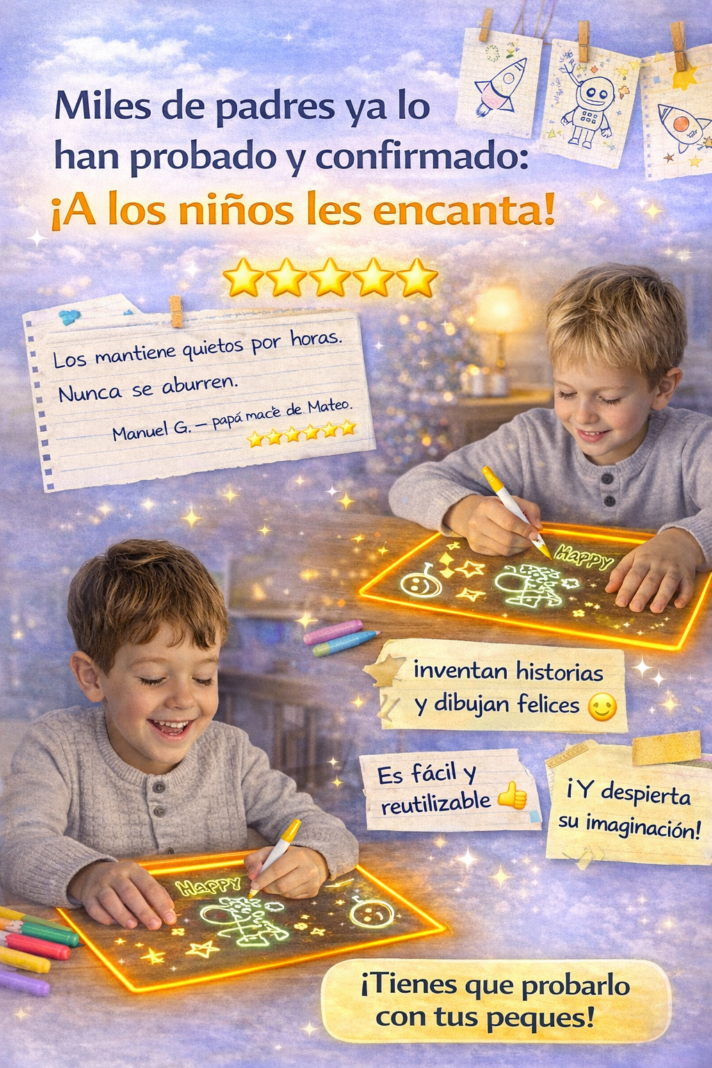 “Muy bonito, se ve clarito cuando prende. Lo usamos en la tarde y no ensucia. Súper para que se entretenga.”